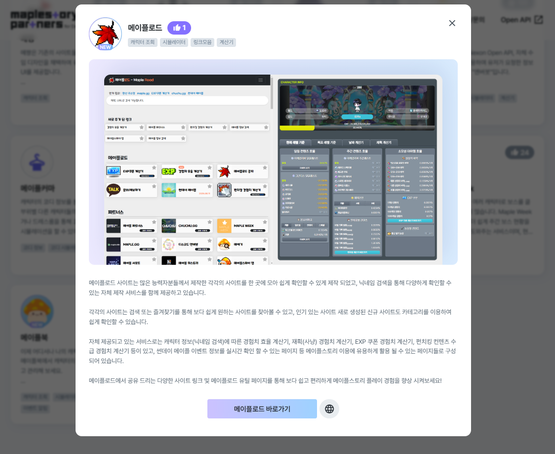 메이플스토리 파트너스는 아래 이미지와 같이, 메이플스토리 OPEN API를 통해 개발 된 사이트 개발자를 위한 파트너 프로그램입니다.